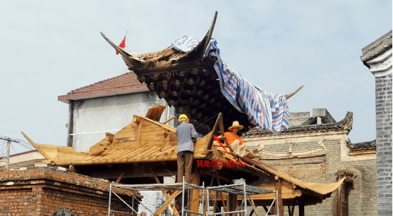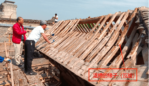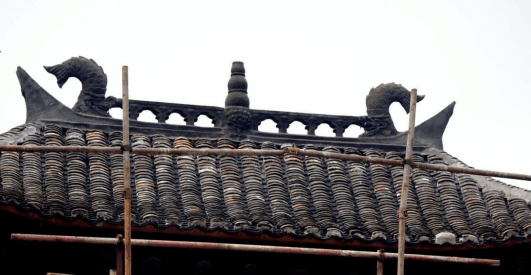 屋脊风化疏松损坏,采用原工艺复原重塑大花夔龙正脊及高翘的草凤戗脊。瓦面是南派建筑常用的干槎瓦做法,年久失修缺损严重。本次修缮增设了10㎜木望板构件,做防潮防腐更好地保护了椽木,因干槎瓦渗漏,防潮性能差,造成椽木逐年温糟碳化,致使瓦面变形漏雨。