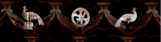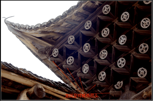 最大亮点是牌楼正面,五层“幞头”团花构件中间核心位置。有三个一套团花组合,造型图案特殊。分别是左右两“凤鸟”于高冈之上回首而望;