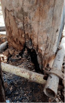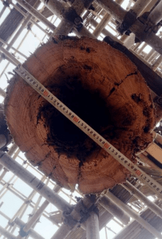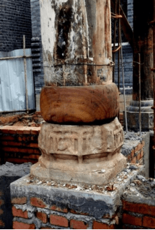 两大柱根糟朽高度有300㎜左右,左边柱根不知何年何因还遭到火烧,柱根部损毁达2/3。采用“墩接”法已不可能在大面积空心柱实施,既不美观又不耐久。