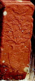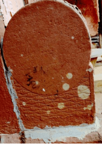 大门两侧一对红霞石抱鼓,从雕刻部位可分为基座(门枕石部位)、鼓架、门鼓、鼓顶,分别雕有纹饰,鼓架两侧流水如意纹;正面柿蒂花、牡丹花安于瓶中。门鼓正面写实手法体现出鼓皮鼓钉,鼓面如日在如意水纹之上,寓意“旭日东升”。鼓顶趴一像狮非狮的瑞兽,这可不是一只普通的狮子,而是龙生九子的“椒图”镇宅避邪之功用。