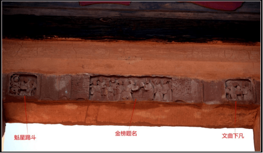 红霞石框宕,在做防风化清理时发现有雕刻被石灰摸埋,清理出三幅精美的雕刻,都是科考人物典故,分别为右“文曲下凡”,左“魁星踢斗”,中间一幅九位人物“圣旨图”金榜题名,梦想成真的美好愿景。从雕刻风格手法、人物服饰、衣冠穿戴皆为明朝时期特点,进一步佐证了该建筑是明时期所建。