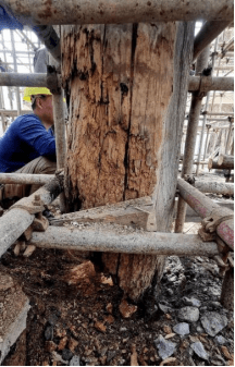 主楼大柱内部遭蚁害空心处多达1/2,部分甚至达2/3,榫卯处更多。因年久街面升高,柱础石、柱根都埋于地下500㎜多,造成柱根糟朽。