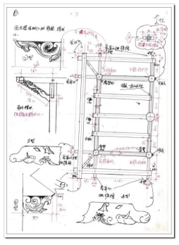 虽然前期对“进士牌楼”建筑群有所了解,但4月15日还是带领施工单位、桥头村委会、促进会、村里的年长老人等有关人员又到现场再做勘查论证。勘查结论,河卵碎石墙体开裂变形、墙头部分坍塌杂草丛生、墙皮脱落严重,瓦面主次楼脱落残损85%、对柱、大木梁架、基木糟朽蚁害程度等也有了更进一步的判断。另外就是主楼大柱、如意斗栱还较完整。