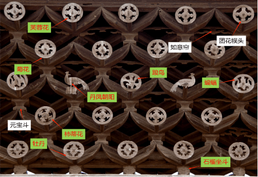 五层翘昂端头装饰“幞头”团花构件,取五种自然动植物作为装饰图纹。取其谐音都有自己的寓意与整体的表达。